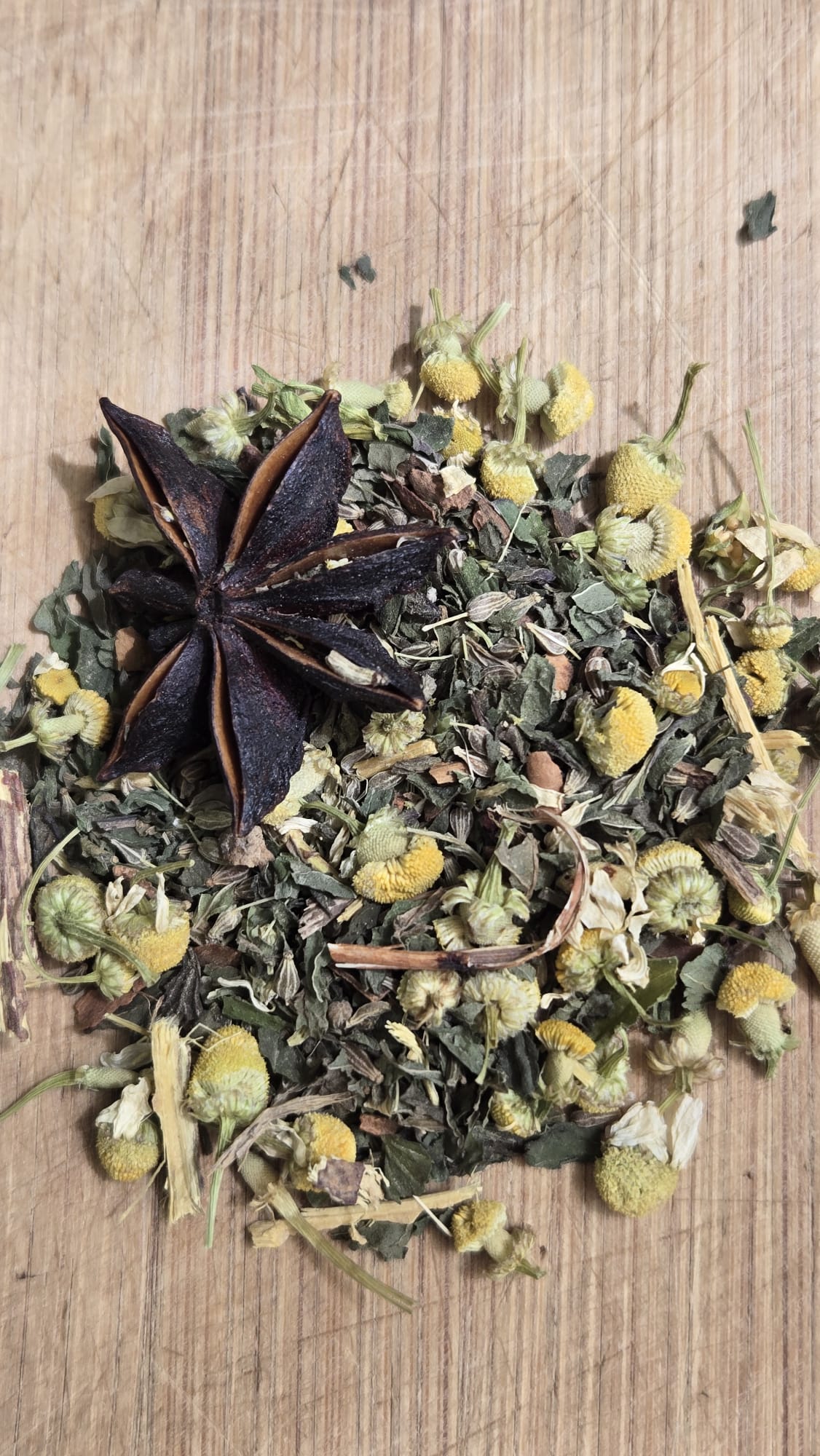 Manzanilla, menta, regaliz, anís en grano, canela, anís estrellado. 100% natural. Sin aditivos ni aromas.