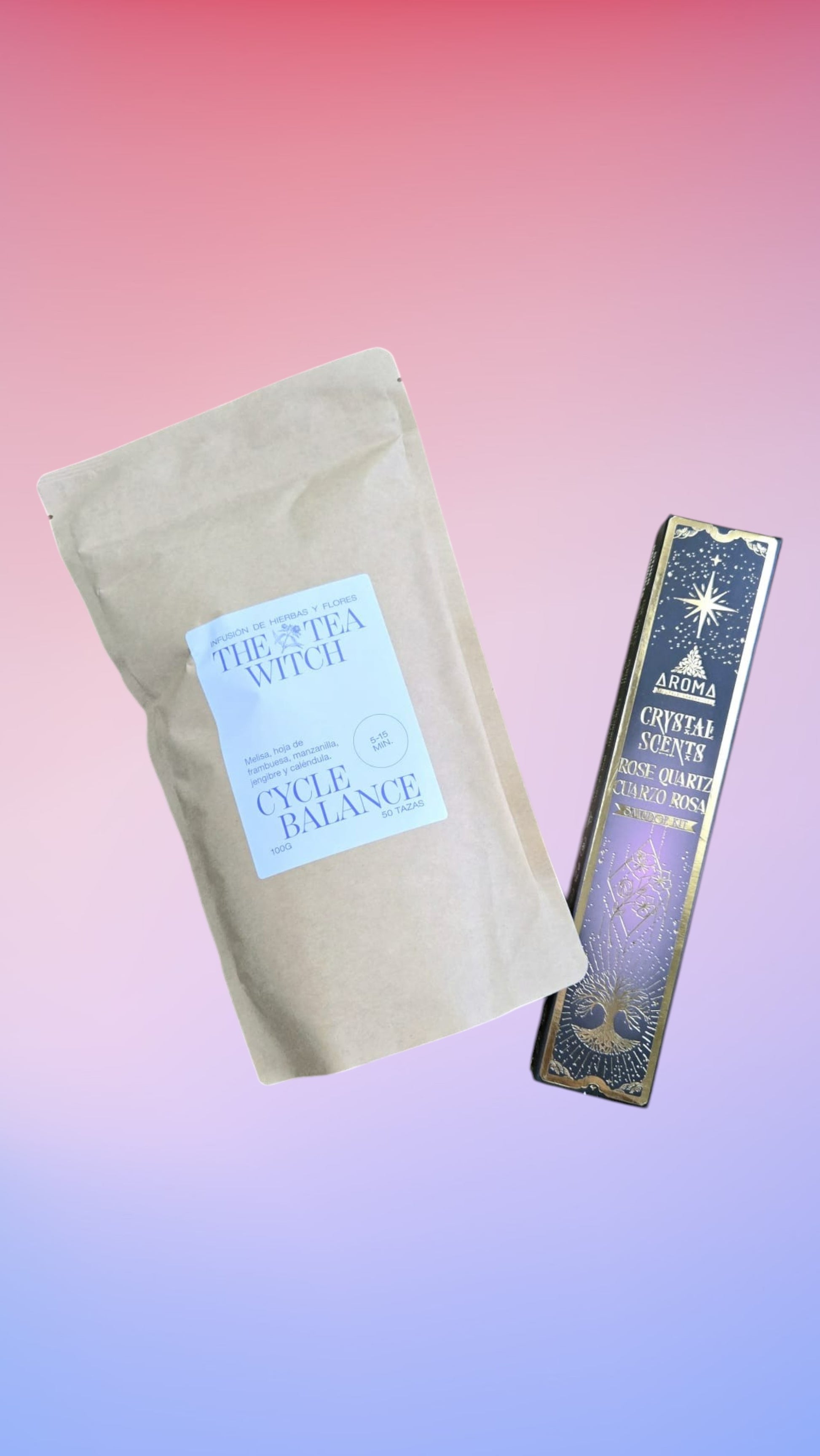 Este pack une el equilibrio de la tisana Cycle Balance con la energía amorosa del incienso de cuarzo rosa de Crystal Scents de Aroma, hecho a mano con varillas orgánicas y chips de mineral.